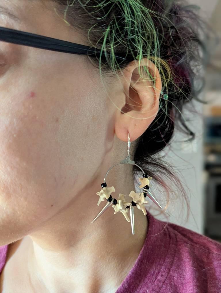 These earrings are made from small sized real vertebrae bones, black glass beads, and silver spikes.