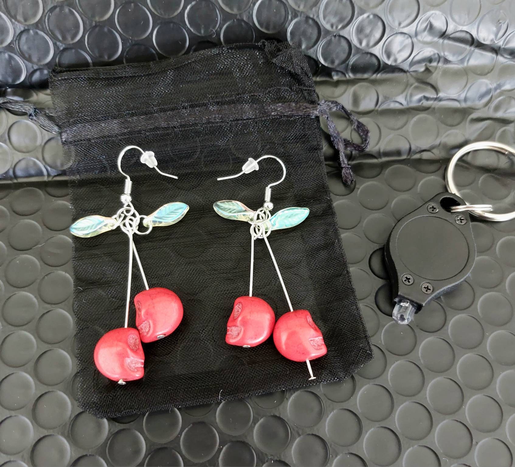 A new take on cherry jewelry...these are red skulls! They're made with uranium glass beads for the leaves, so that when you shine UV light on them they light up.