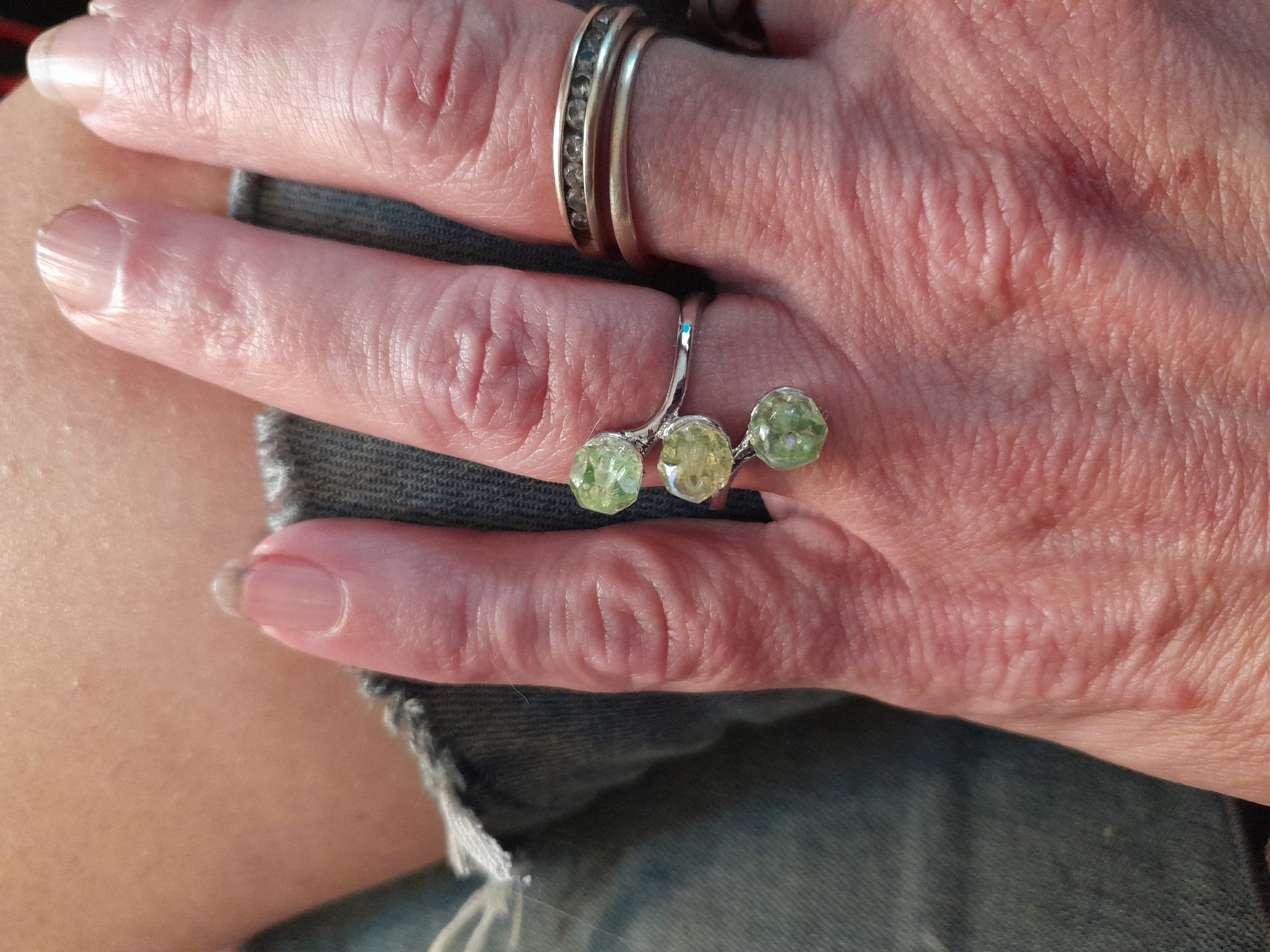 This sterling silver plated ring features three gorgeous yellow green uranium glass beads.
