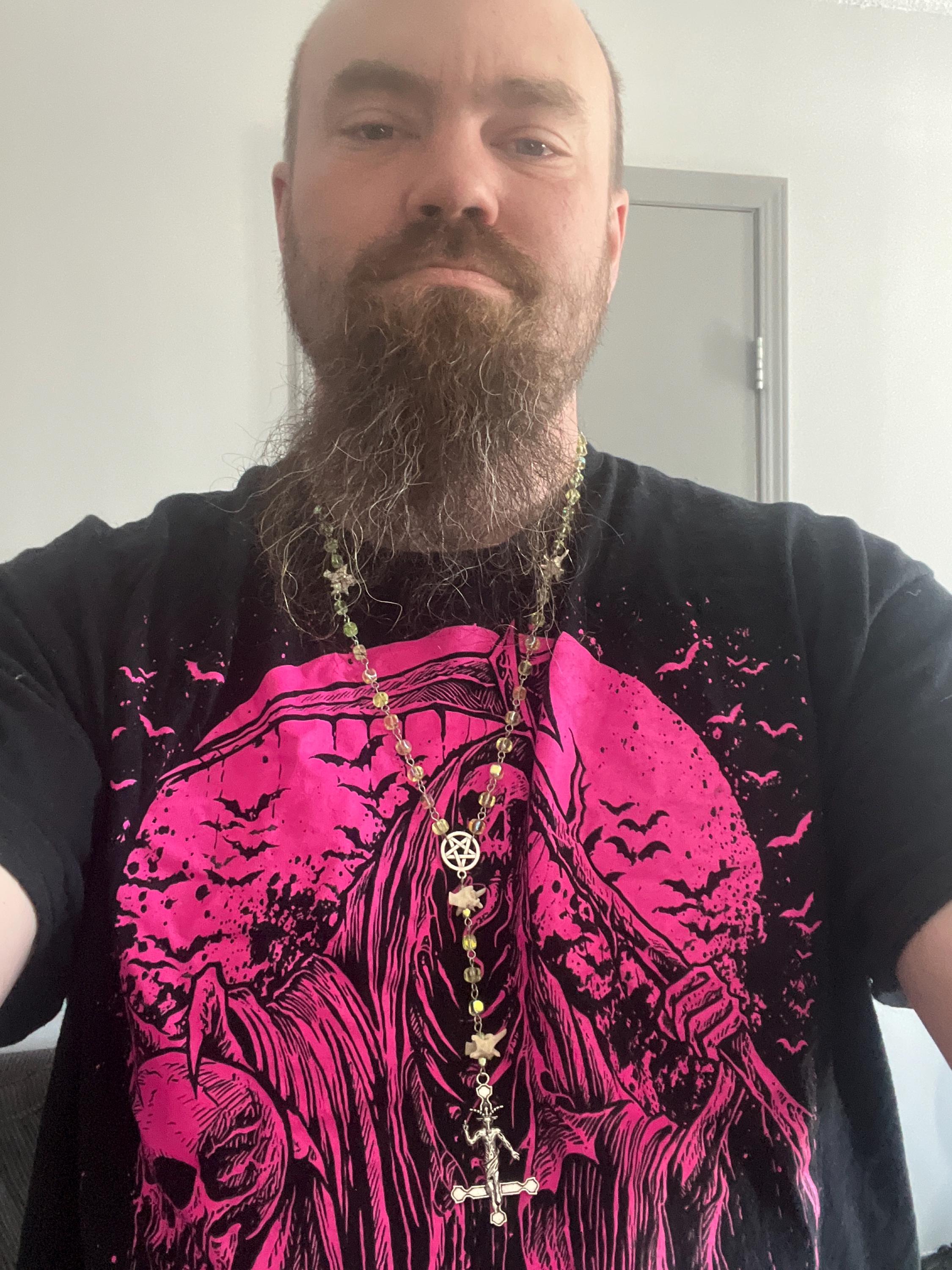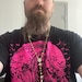 This unique Rosary has a little bit of everything! The necklace is made of square AB (shiny) uranium glass for the "hail Mary" beads, rattlesnake vertebrae "our father" beads, a pentagram connector and an upside down Baphomet cross.
