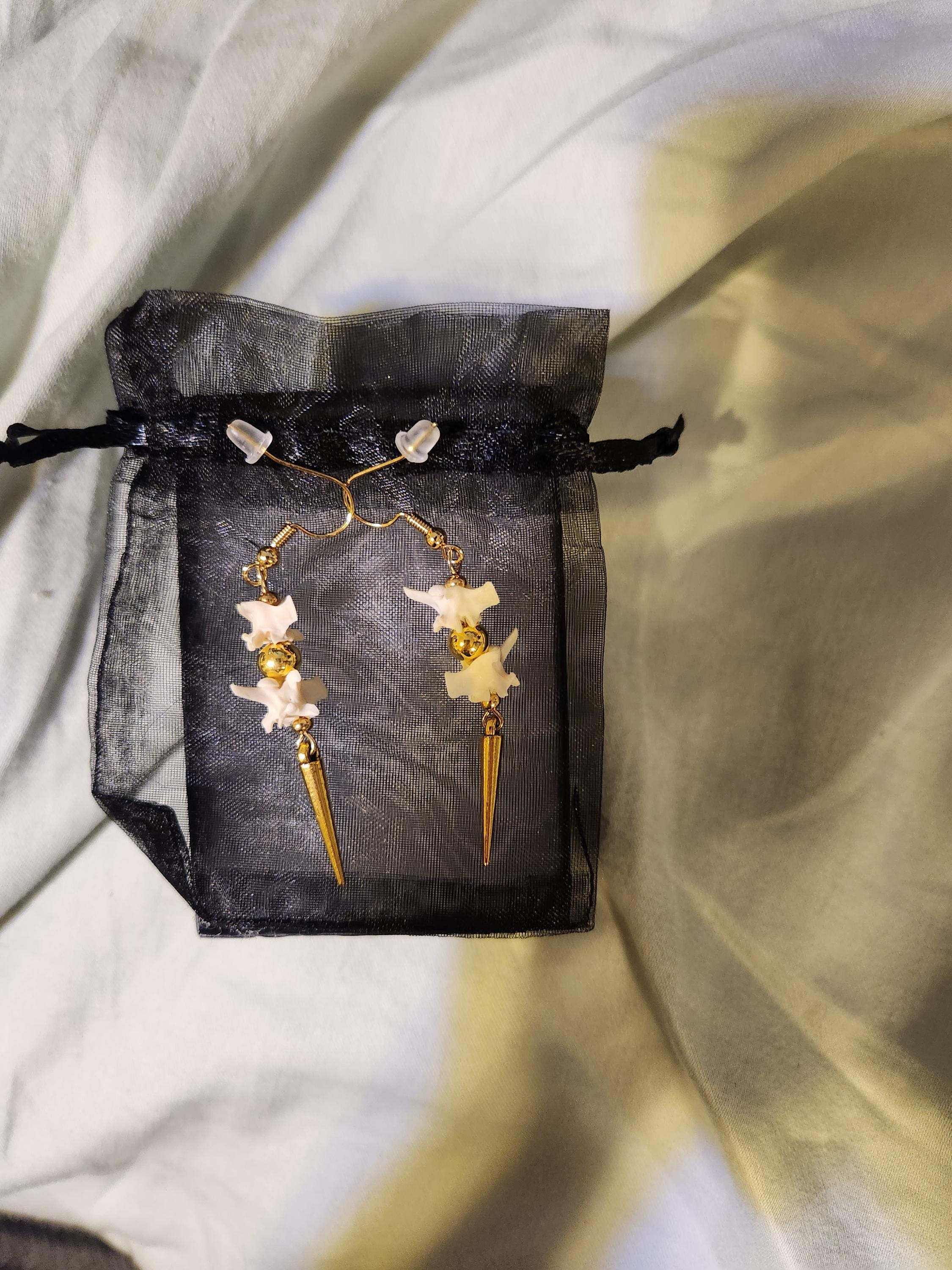 Show off your love of dead things with these macabre but super pretty earrings! They are made with tiny snake vertebrae, and a gold spike charm.