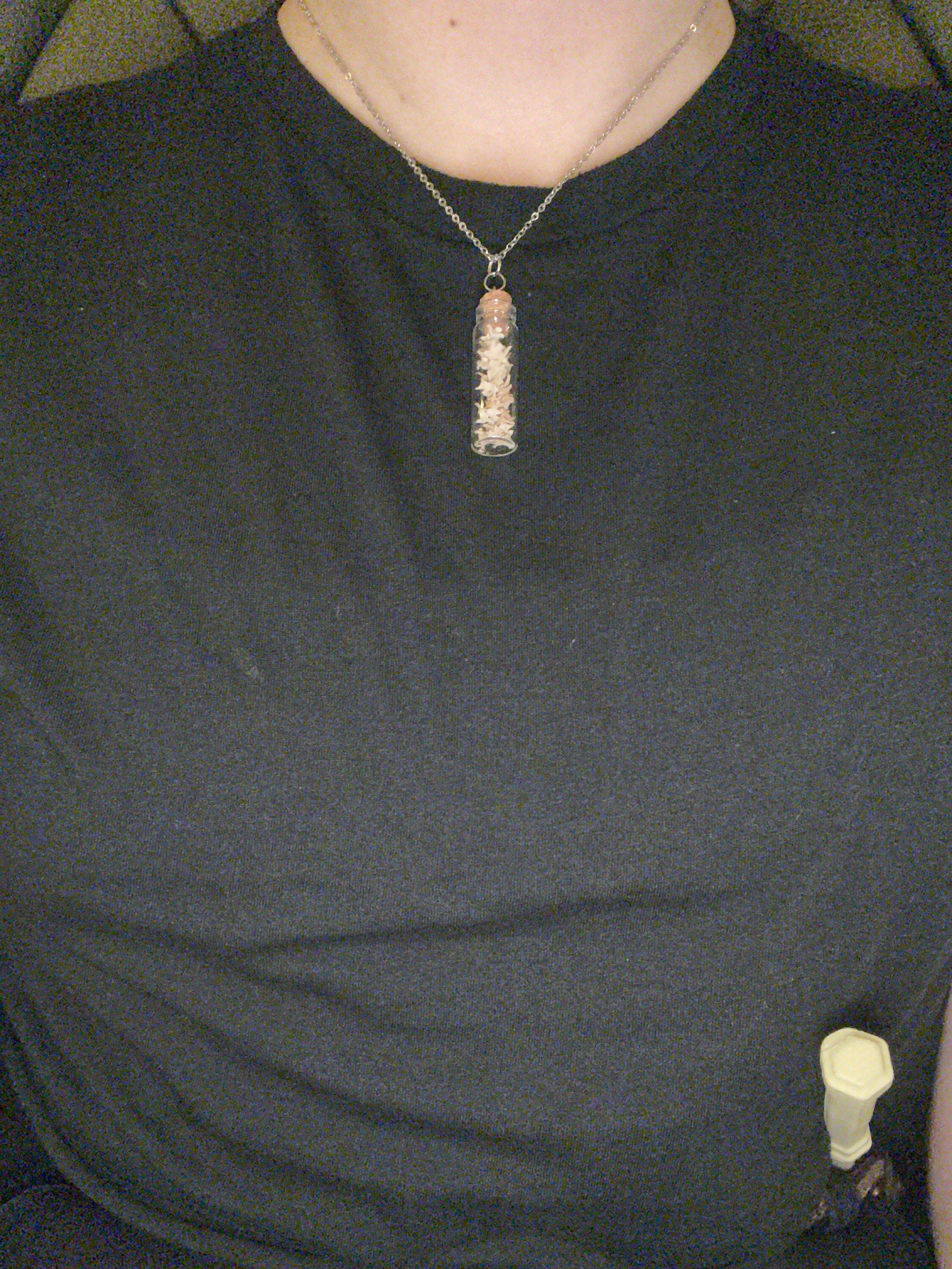 This necklace features a vial full of tiny rattlesnake vertebrae. The chain is stainless steel, 18 inches.