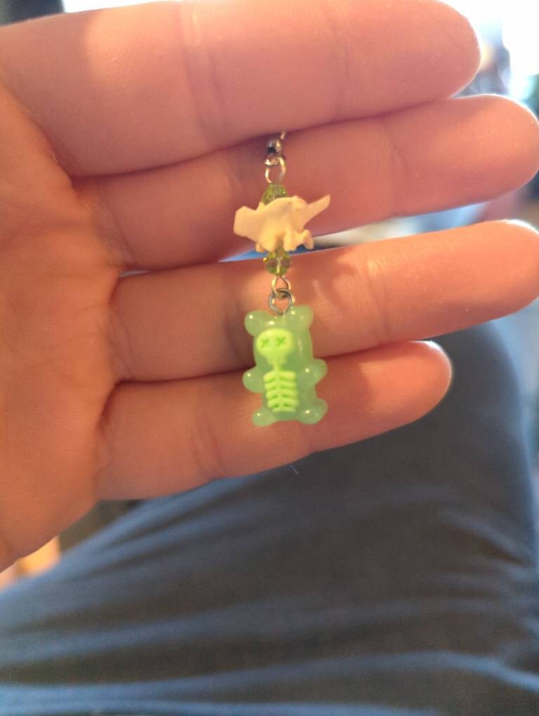 Show off your love of dead things with these macabre but super cute earrings! They are made with snake vertebrae, and adorable skeleton gummy bear charms.